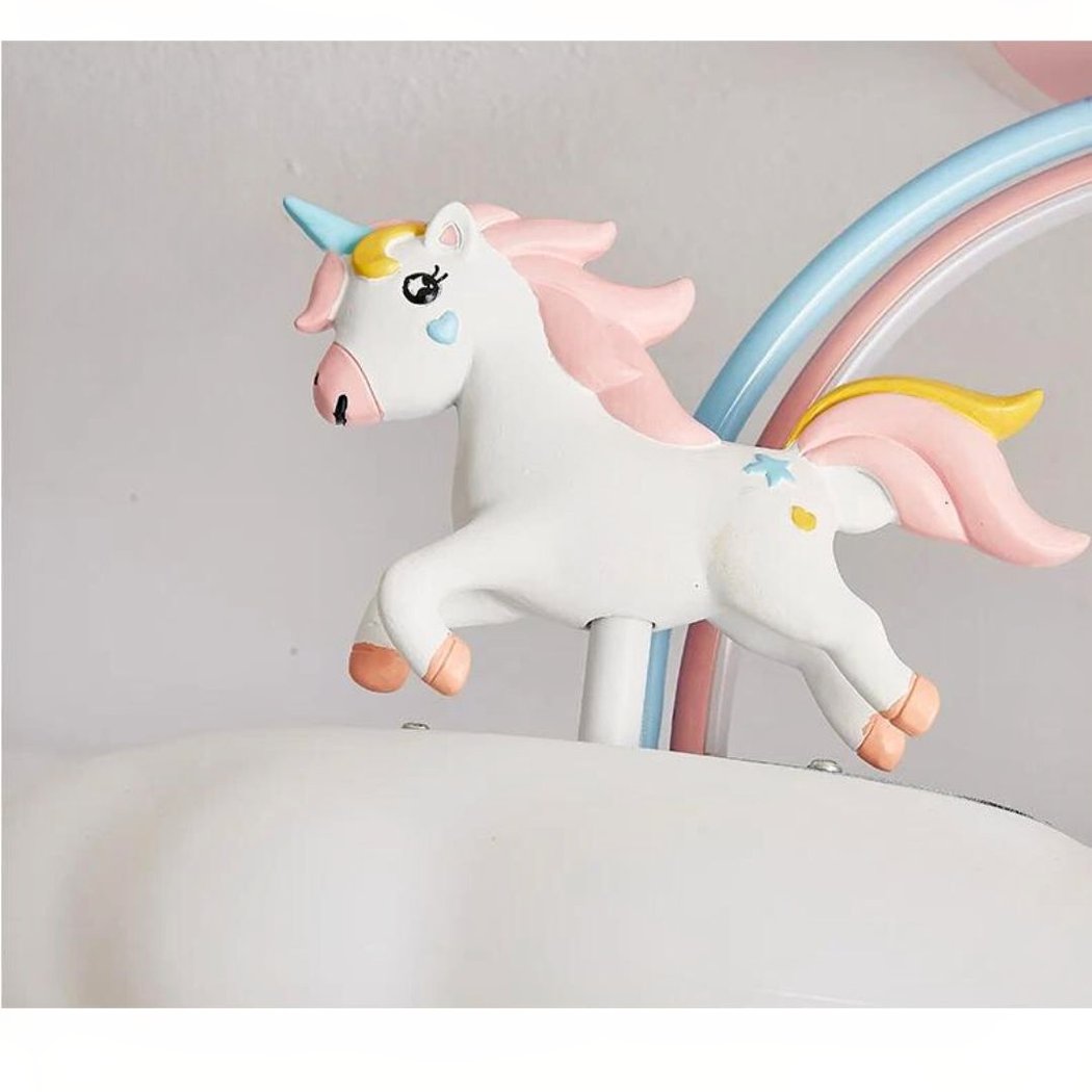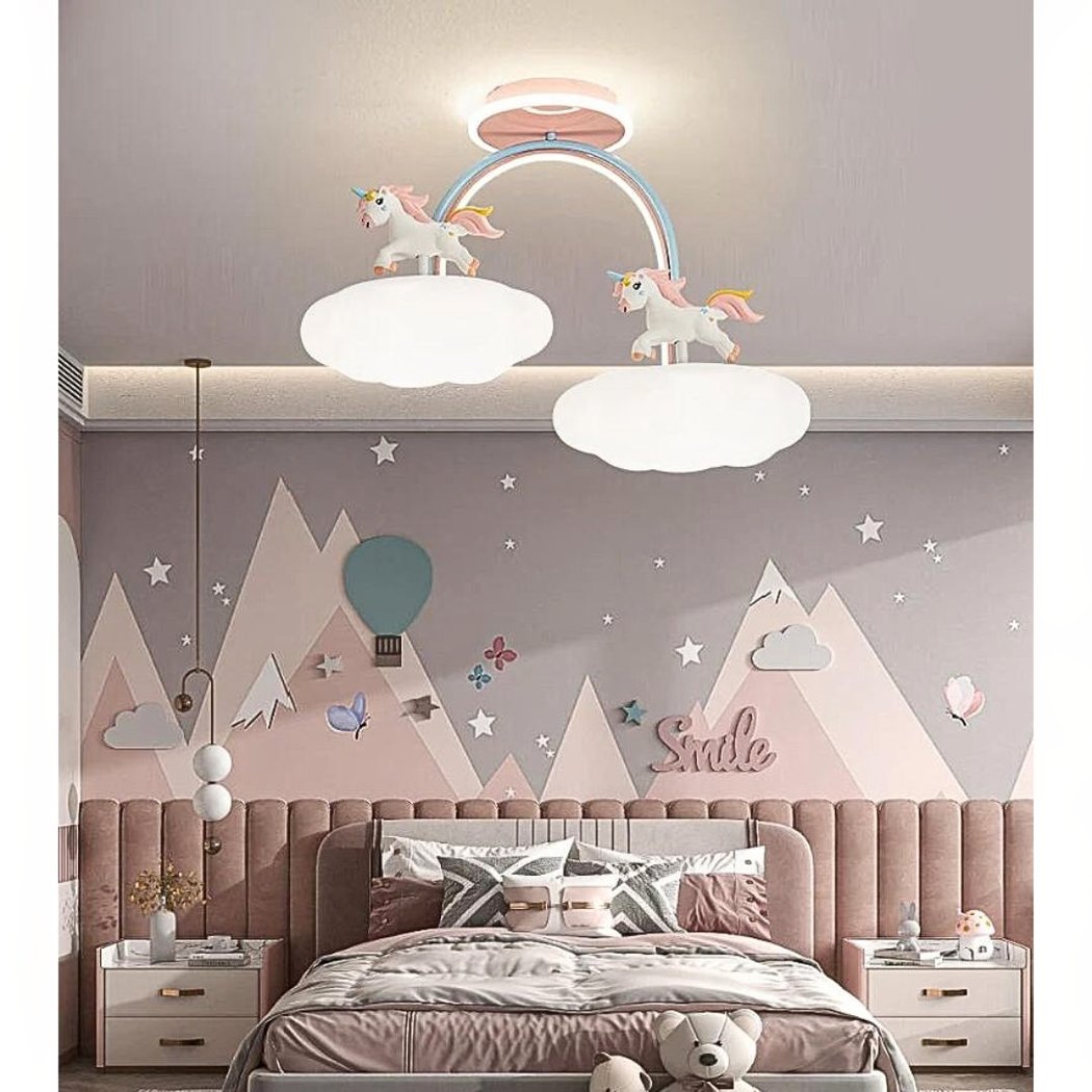 Transform your child's bedroom into an enchanted world with our pink and white unicorn chandelier. Perfect for a child's decor, this colorful chandelier adds an adorable touch to her space.