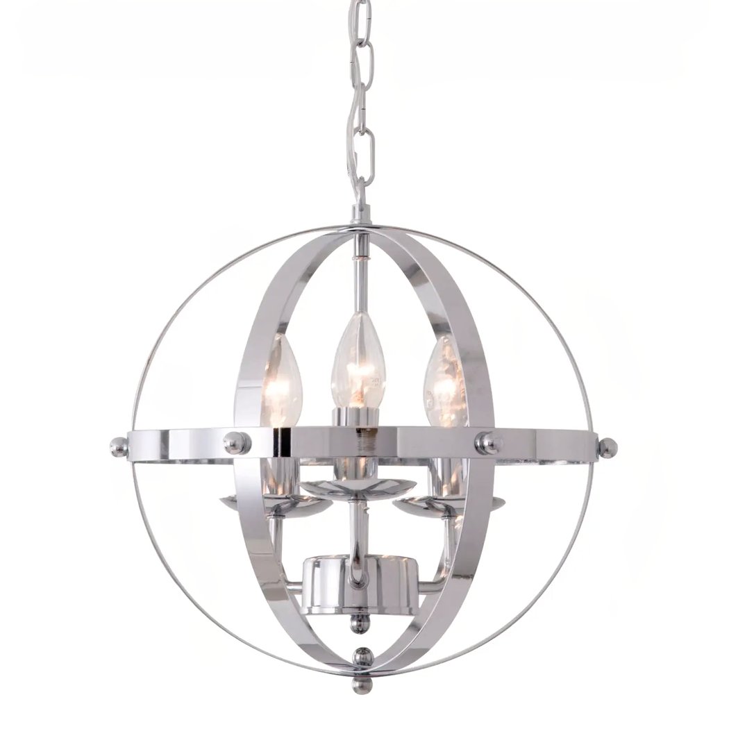 The imitation chandelier inside the sphere adds a retro touch to this already stylish chandelier. This chandelier is available in a black color that brings a timeless, sober edge to your decor, or in a silver color with shiny chrome that reflects the light from the 3 bulbs that will be in the center of the sphere.