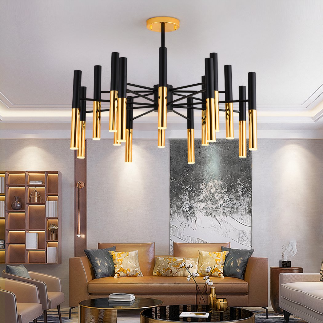 The modern LED black and gold tube chandelier is the epitome of style and functionality. Its elegant tubular form is enhanced by gold accents, providing a striking contrast that immediately catches the eye. A centerpiece for any modern interior, diffusing a soft, warm light.