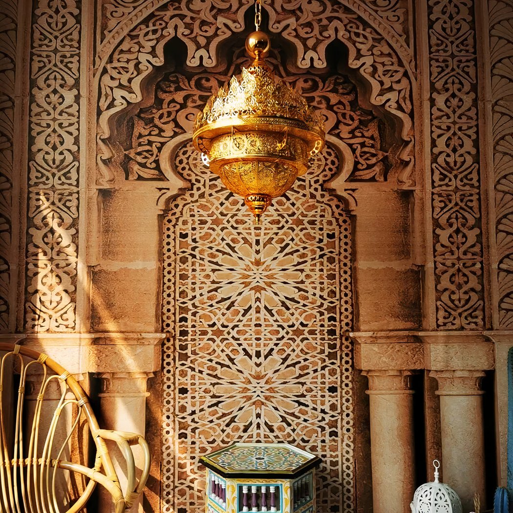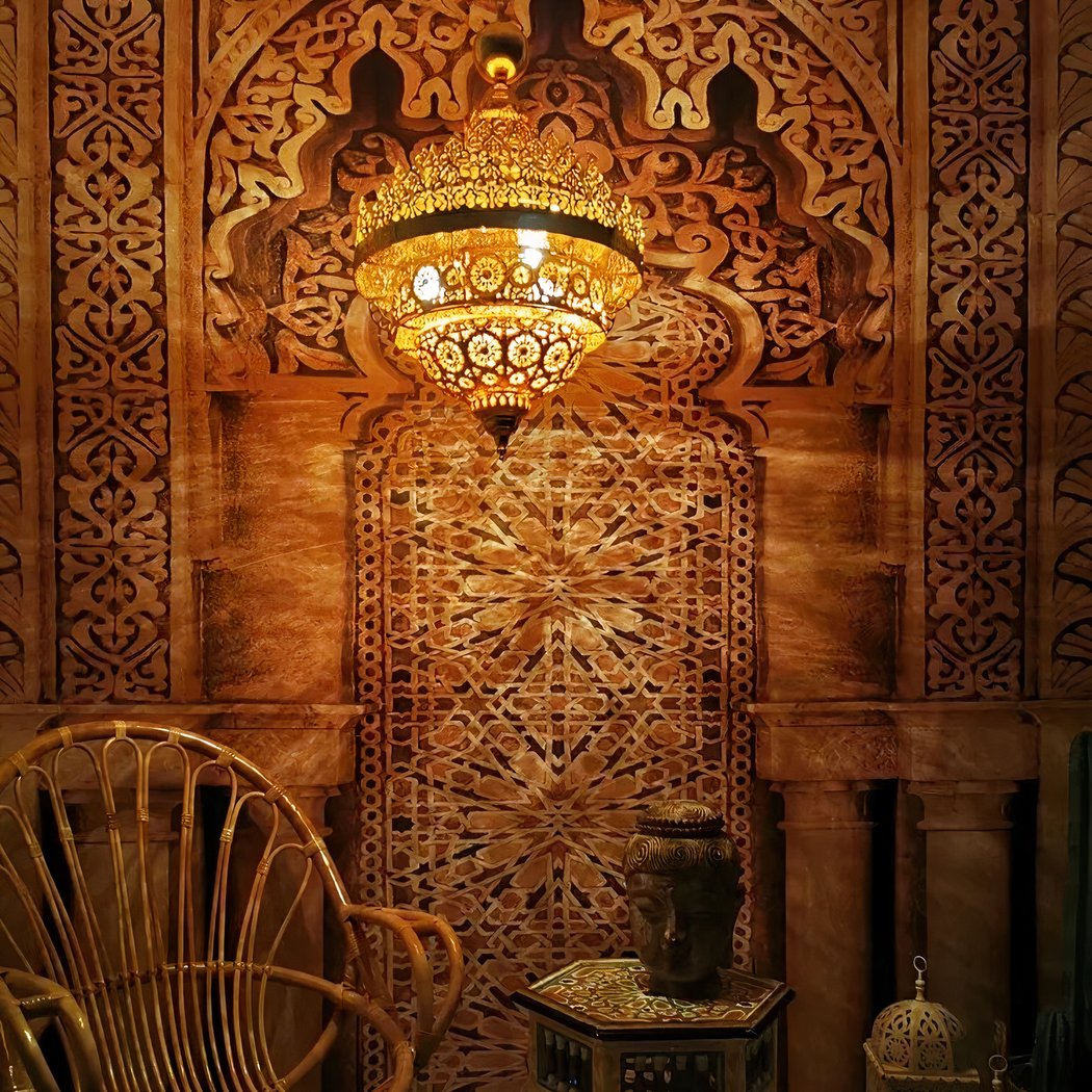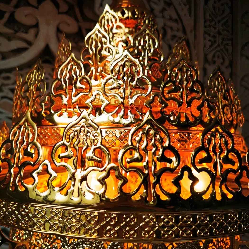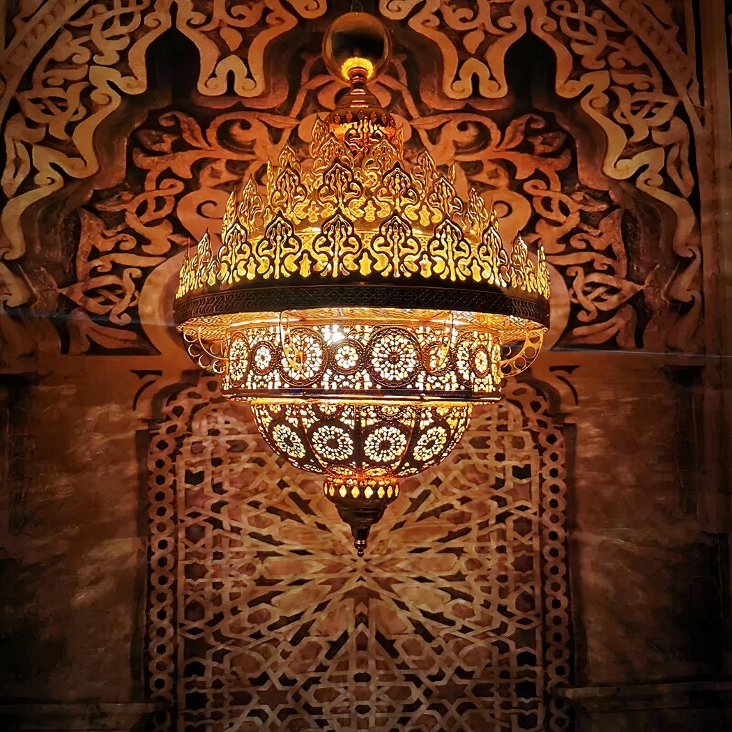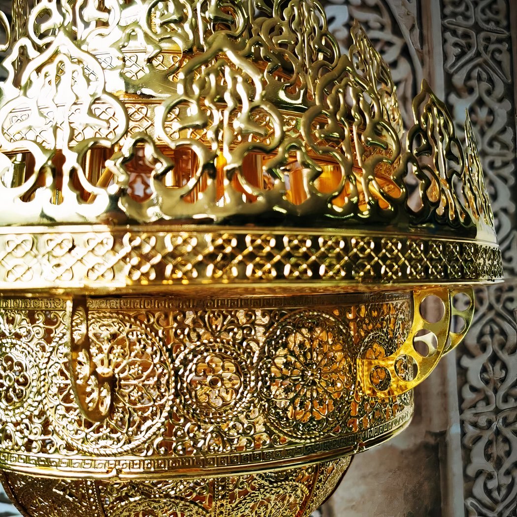 The characteristic motifs of this gold-colored Moroccan flame chandelier evoke a mysterious and strong style, it embodies the spirit and essence of the Orient. It represents elegance and splendor. Every detail, every curve, tells a story of distant lands, golden deserts and lost cities. This unique piece offers a sensory journey, enveloping each piece in a mysterious veil of splendor and magnificence.