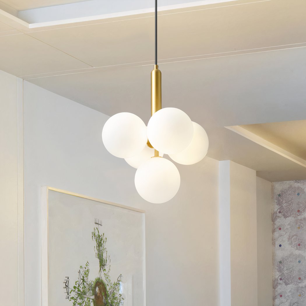 Thiscluster-shaped hanging light is more than just lighting, it's a decorative piece in its own right. Its sleek design makes it a suspended work of art that will blend perfectly with any interior style, from the most modern to the most traditional. The five white glass balls diffuse light to create a warm, welcoming atmosphere, while the metal stem in black and gold hues adds a touch of luxury to your space.