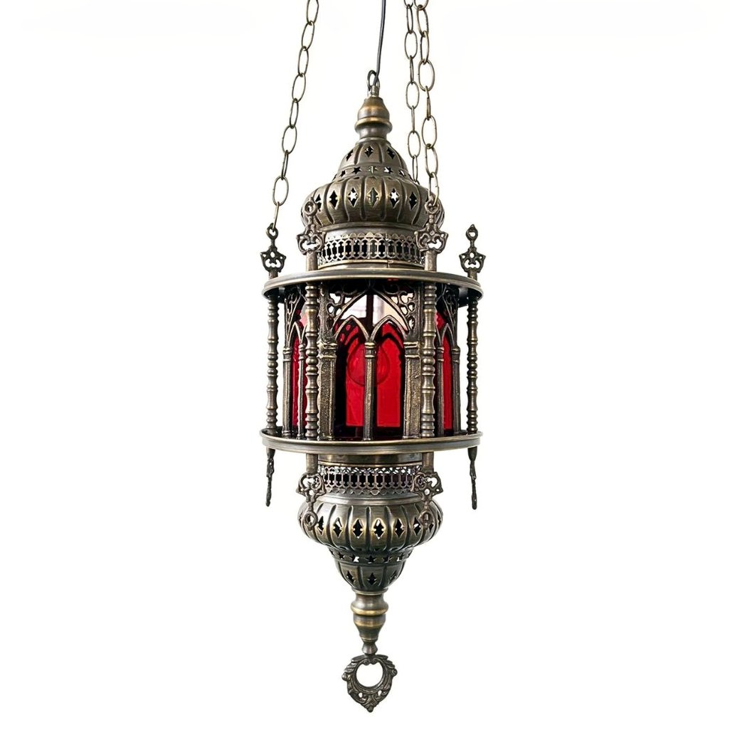 This hanging lamp comes in the form of a vintage Moroccan lantern, crafted from quality wrought iron and featuring a red glass shade. Its authentic, elegant design adds an exotic touch to your home decor.