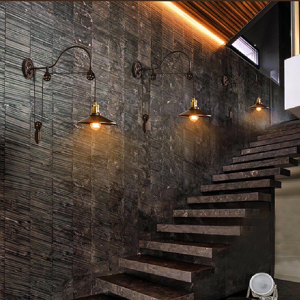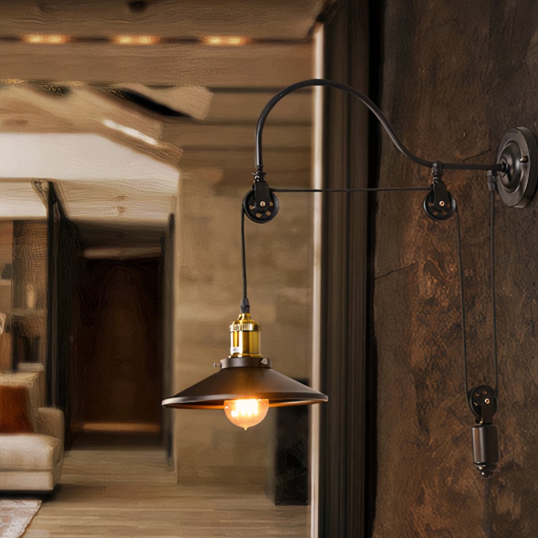 With its elegant design, this wrought iron wall light with pulley will add a touch of sophistication to your interior. The black metal and pulley add a retro touch while remaining very modern, adapting just as well to a contemporary interior as to a more classic decor. The pulley system, far from being a mere decorative element, integrates perfectly with the design and adds an extra layer of functionality and aesthetics.